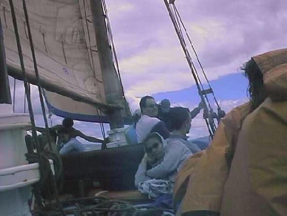 when we finished our dive we had lunch on board before we headed out to sea to Sail…the waters were quite rough and it clouded up and the spray was very chilly…we did this about an hour..and i think we could have ended it a while earlier as it was a little to cold and choppy for my taste. on the way back to sure another sailboat chanllenged us to a race, which the crew accepted and we won . we pulled back into dock where we bought a couple of t-shirts before heading back to the condo for a nap.