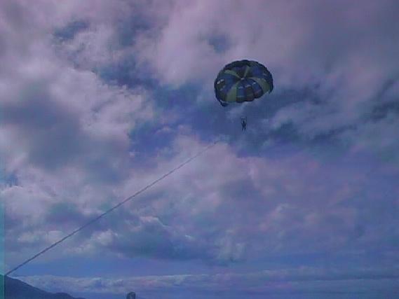 we got up at 7am to go to our parasailing expedition. It was a lot of fun. Roger went first and the picture that is attached is roger at 400 ft in the air. next was my turn; it was very quiet up there the only sounds you could hear was the wind and the engine from the boat. but the odd thing that happened was as soon as the last group of parasailers on our boat was finished the engine started smoking…so we had to call another boat and have us toed into shore.